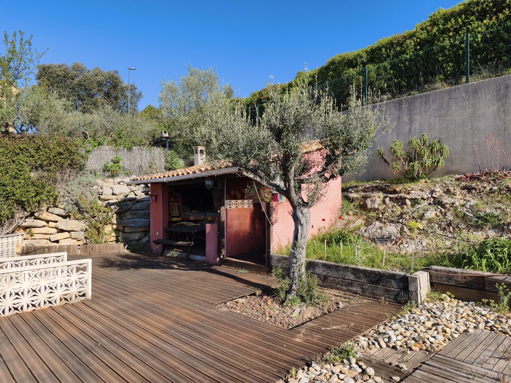 Elle se compose dès l’entrée de rangements, grande pièce de vie baignée de lumière , cuisine ouverte avec son accès sur le terrain de l’arriere offrant une tranquillité, sans vis à vis. Vous pourrez profitez d’une cuisine d’été ( barbecue, four à pizza.) avec son potagé.
